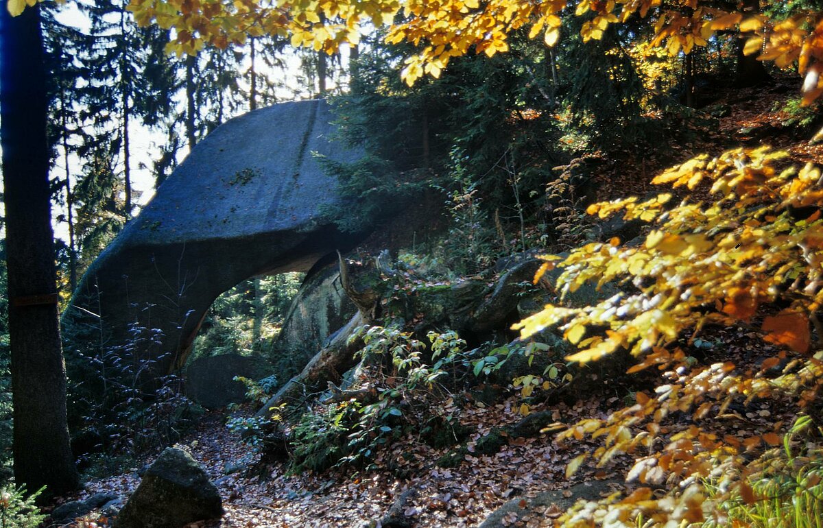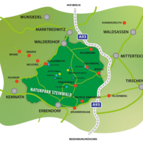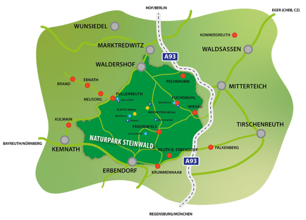 Eingebettet zwischen Fichtelgebirge und Oberpfälzer Wald wölbt sich der über 900 Meter hohe Granitrücken des Steinwaldes zu einem markanten Landschaftsbild der nördlichen Oberpfalz auf. Die geschlossene Waldlandschaft wird von Nadelbäumen, immer wieder mit schönem Mischbestand durchsetzt, geprägt. Aus dem harten Urgestein haben Wind und Wetter steil aufragende, bizarr geformte Felsengruppen genagt: Räuberfelsen, Vogelfelsen, Saubadfelsen und viele andere mehr. Auf der Platte, dem 946 Meter hohen Hauptgipfel des Steinwaldes, wurde der Oberpfalzturm erbaut, der einen weiten Rundblick gewährt. Der Naturpark „Steinwald“ ist der zweitkleinste der 19 Naturparke in Bayern.